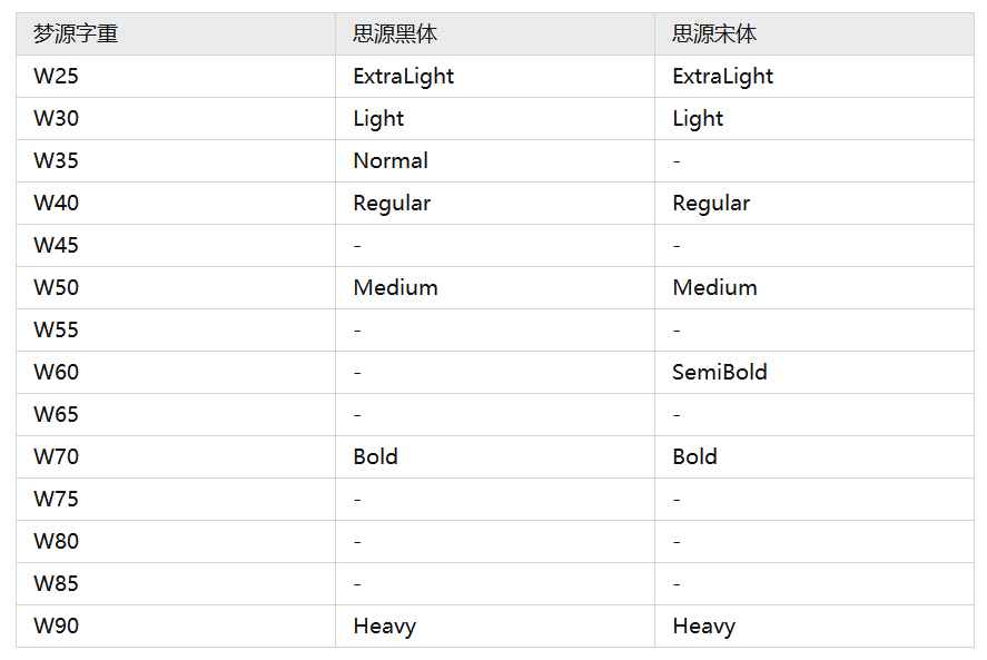 本系列的字重与思源黑体、思源宋体的对应关系,有对应则表示与思源系列完全相同。