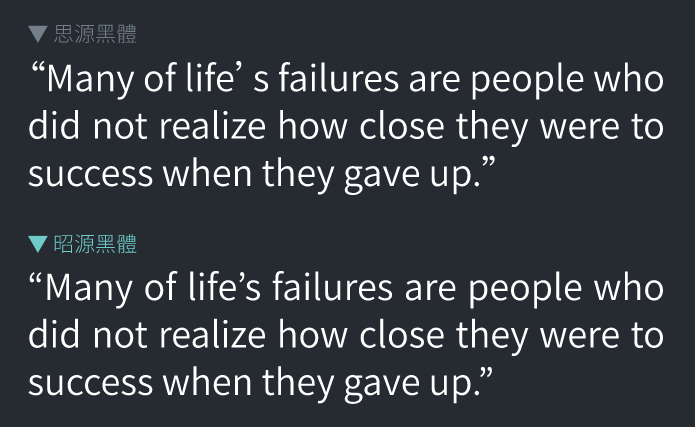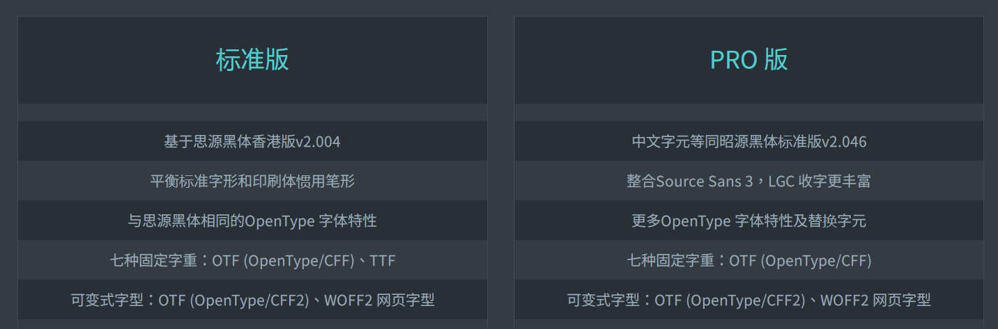 更完整的LGC 收字 (PRO 版):昭源黑体Pro 版继承昭源黑体的所有特点,并进一步整合Source Sans 3 字体,减低使用单套字型时遇到缺字「豆腐」的机会。保留Source Sans 3 的OpenType 功能,提供更丰富的字元变化选择。