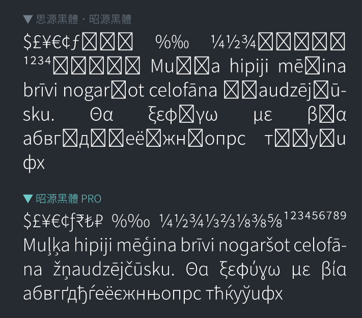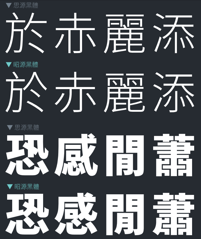 额外增加中文新造字:思源黑体支援的中日韩字集本身已经足够日常使用,几乎不会有缺字问题。昭源黑体除了加入四个香港会用到但不在HKSCS 字集因而未获思源黑体收录的,更额外增加超过1,000 个新造字,使之可以应付以下粤语相关网站的使用(仅限字头)。