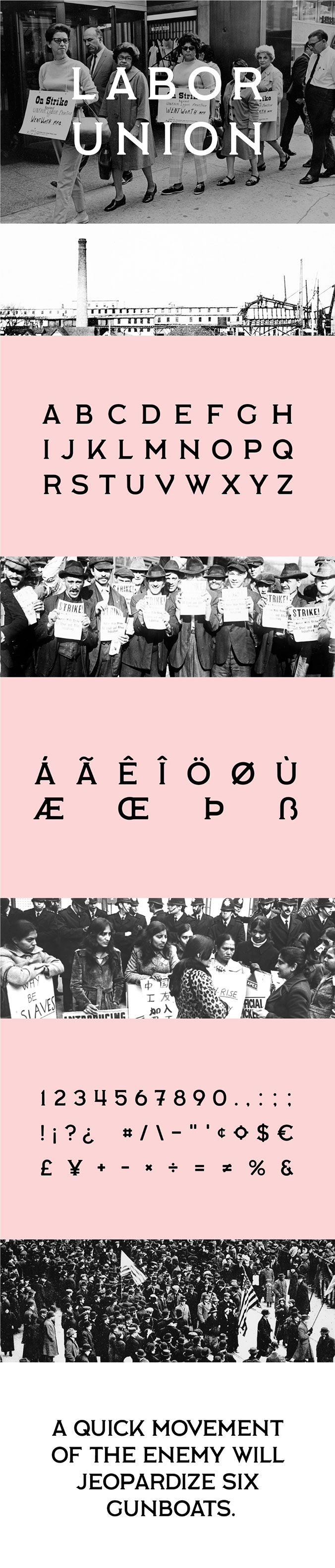 LABOR UNION字体由伊萨卡学院的学生组织“劳动行动学生”制作的。他们争取公立学校员工的公平待遇,并与当地县工人工会(汤普金斯县工人中心)紧密相连。虽然这种字体是为任何工业用途以及与工人权利和社会主义有关的任何东西而制作的,但这种字体的潜在用途是无穷无尽的 - 所有人都可以自由地享受它。