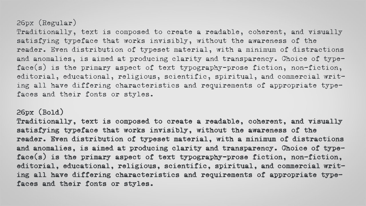 X Typewriter是一款根据SIL OFL协议发布的免费英文字体,等宽打字机风格, 包含2 种样式(Regular、Bold)和 148 个字形,支持 7 种语言(阿尔巴尼亚语、英语、印度尼西亚语、拉丁语、拉脱维亚语、斯洛文尼亚语、祖鲁语。)