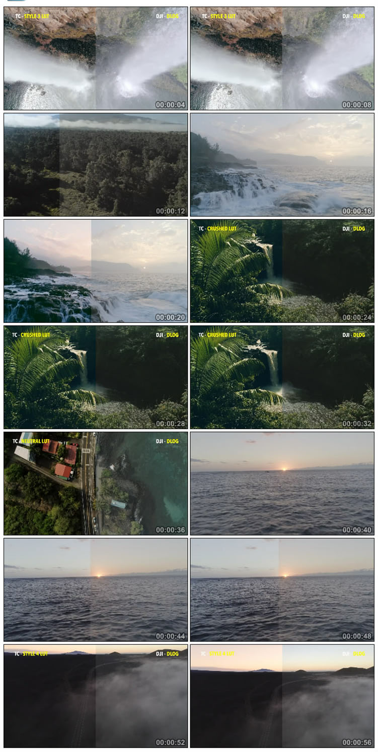 资源介绍: 一共10个预设,Cube格式,每个预设默认包含百分之20、40、60、80、100的浓度,也就是一共50个预设,适用于DLog模式下拍摄的航拍视频