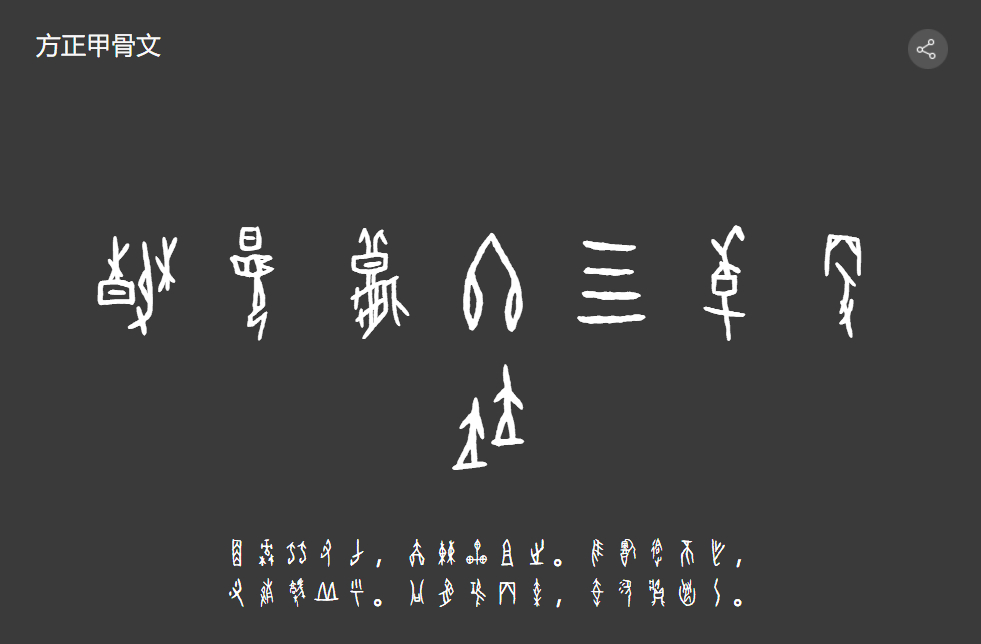 字体特征:甲骨文字库收录字形均在相对公认的已释读的甲骨文范围之内;字形主要以殷墟卜辞原拓和部分周代甲骨文为基础;以典型宾组类为主要字体风格;其字形结体对称而稳定,其线条遒劲坚实、挺拔爽利,曲直粗细均备,笔画多方折。甲骨文字库还原了文字的象形,生动而有趣,又充满了历史的厚重感。
