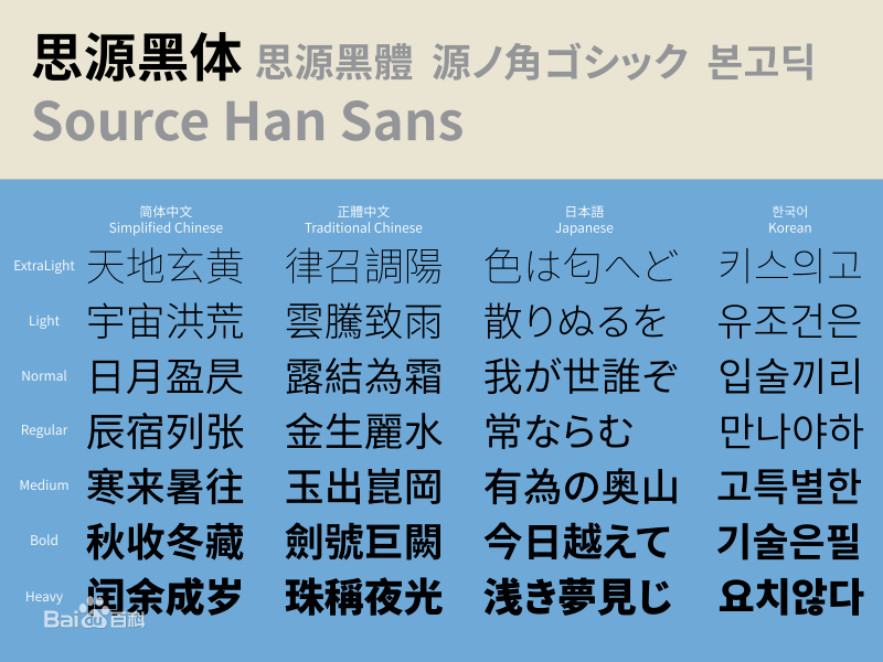 思源黑体是Adobe与Google历时三年在2014年7月宣布推出的一款开源字体,这是一款新的供桌面使用的开源 Pan-CJK 字体家族, 有七种字体粗细(ExtraLight、Light、Normal、Regular、Medium、Bold 和 Heavy),完全支持繁体中文、简体中文、日文和韩文,这些全部都包含在一种字体中。它还包括来自我们颇受欢迎的 Source Sans字体家族的拉丁文、希腊文和西里尔文字形。