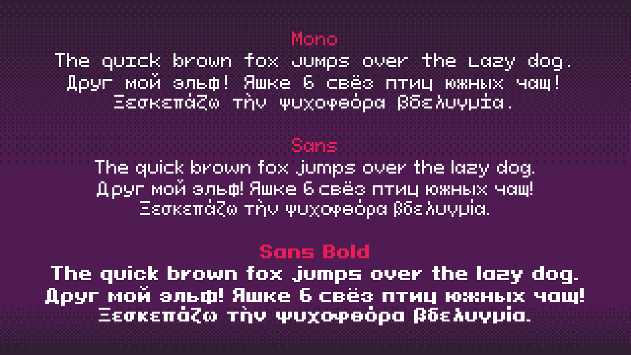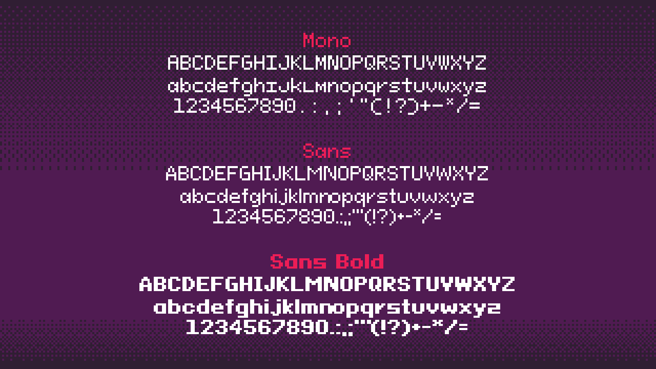 Pixeloid是一款根据SIL OFL协议发布的免费英文字体,含有3种样式(Mono、Sans、Sans Bold)和840个字形,推荐的字体尺寸设置:9、18、36、72、144 px(像素)。