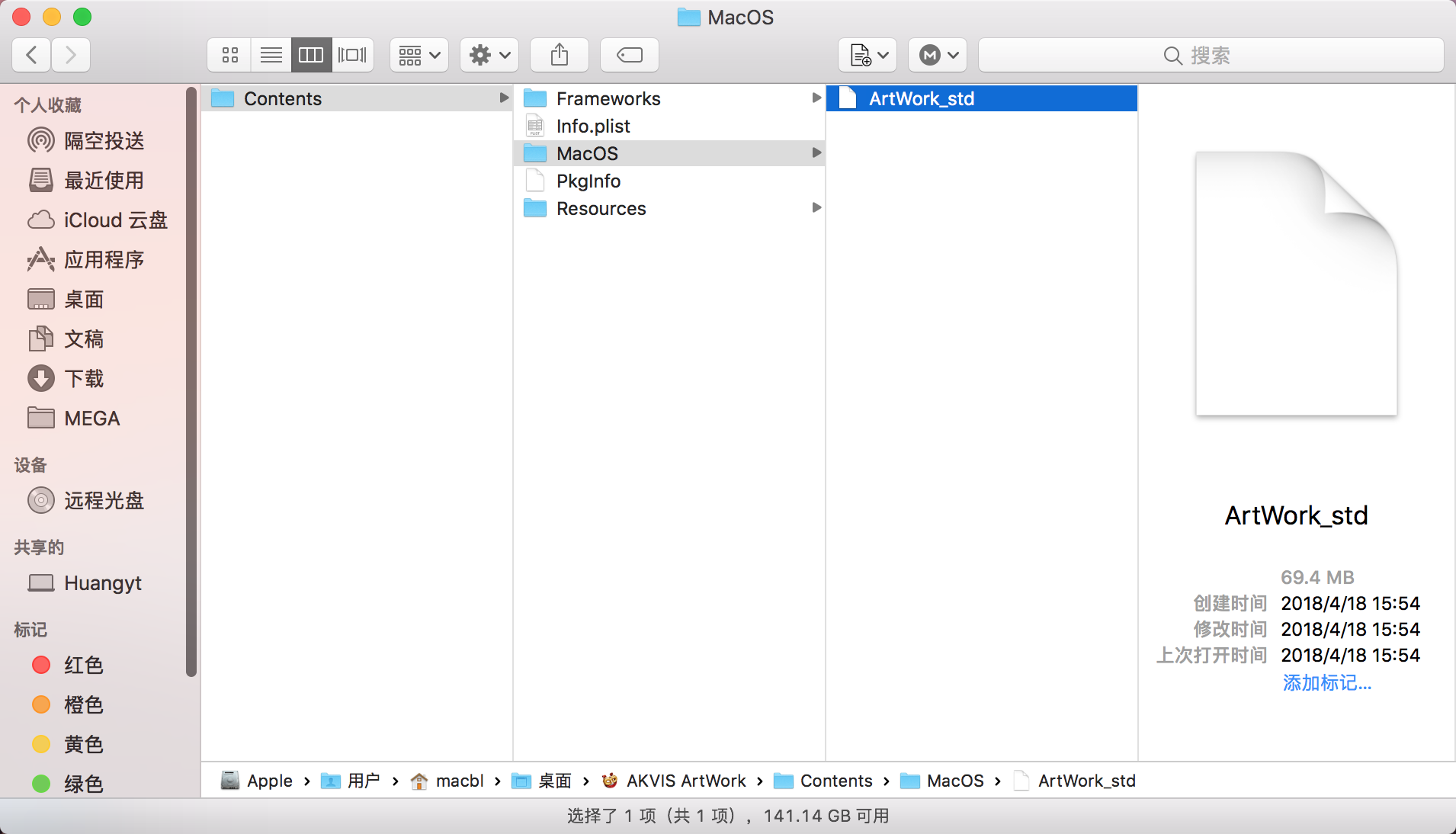 2.依次打开“Contents - MacOS”,找到“ArtWork_std(或Plugin Installer)”文件。大家会发现,这是个类型不明的文件。其实该文件原本是可执行文件,由于权限丢失,才变成了类型不明的文件,导致软件无法打开。