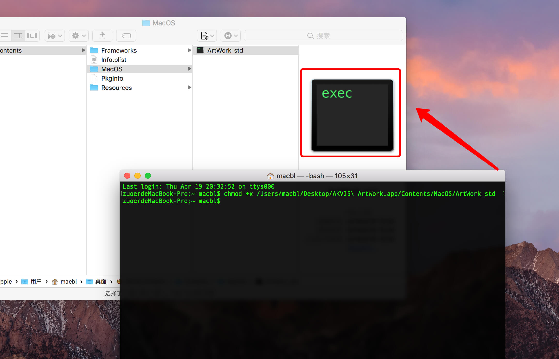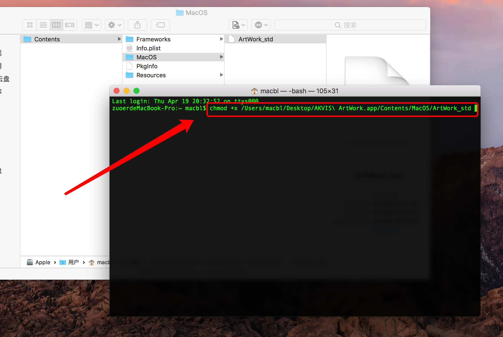 3.打开终端,输入“chmod +x”,注意“chmod”和“+x”中间有个空格,然后再次空格,将“ArtWork_std(或Plugin Installer)”文件拖入终端,接着回车。