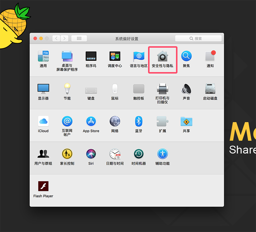 1. 打开系统偏好设置界面,进入安全性与隐私