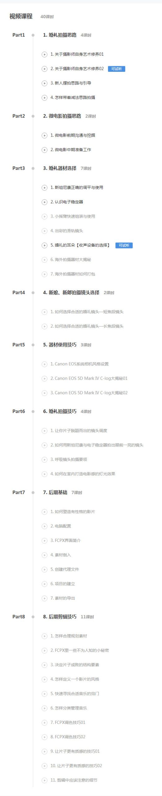 课程介绍:LIKEFILM将多年的婚礼跟拍的理念与拍摄技巧相结合,通过前期、中期、后期三个阶段的讲解,从具体的拍摄思路、器材选择、器材使用技巧、拍摄技巧、后期剪辑等方面,系统的展示了LIKEFILM婚礼电影的完整制作流程及制作经验。