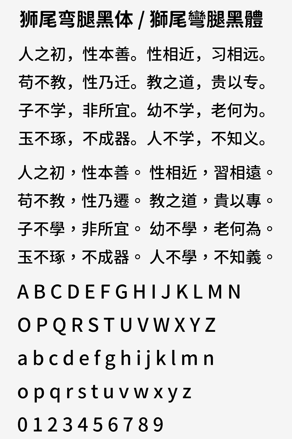狮尾弯腿黑体基于思源黑体变圆改造,更加简明现代化的字体。和思源黑体一样,有7种字重,支持简体中文、繁体中文、韩文与日文,可以免费商用,欢迎大家自由应用、自由优化、自由改作! 狮尾弯腿黑体与「狮尾腿圆」差别在笔触是否有做调整,狮尾弯黑体所套用的效果较少,在笔触没有做调整。 狮尾弯腿黑体与「狮尾弯黑体」差别在有没有拔脚,「拔脚」就是会有较少的笔画,例如移除「口」字的左右下角会多出的短线条。有拔脚的字会较圆,但是会造成有些字因直接去掉腿后左右不平衡、左右不对衬的「悬空」问题。改使用「腿」系列字体就不会有这个问题。