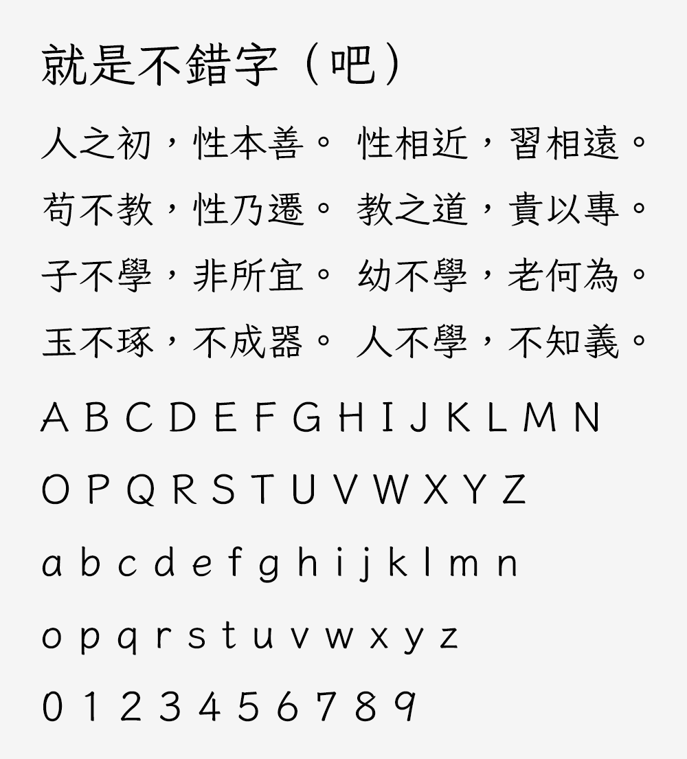 就是不错字(吧)是基于 芫荽 字型改作,由justfont的团队制作,以OpenType 实现输入常见错字即会自动改正功能的开源繁体中文字型,旨在协助所有被生活中各式错字所困扰的朋友。