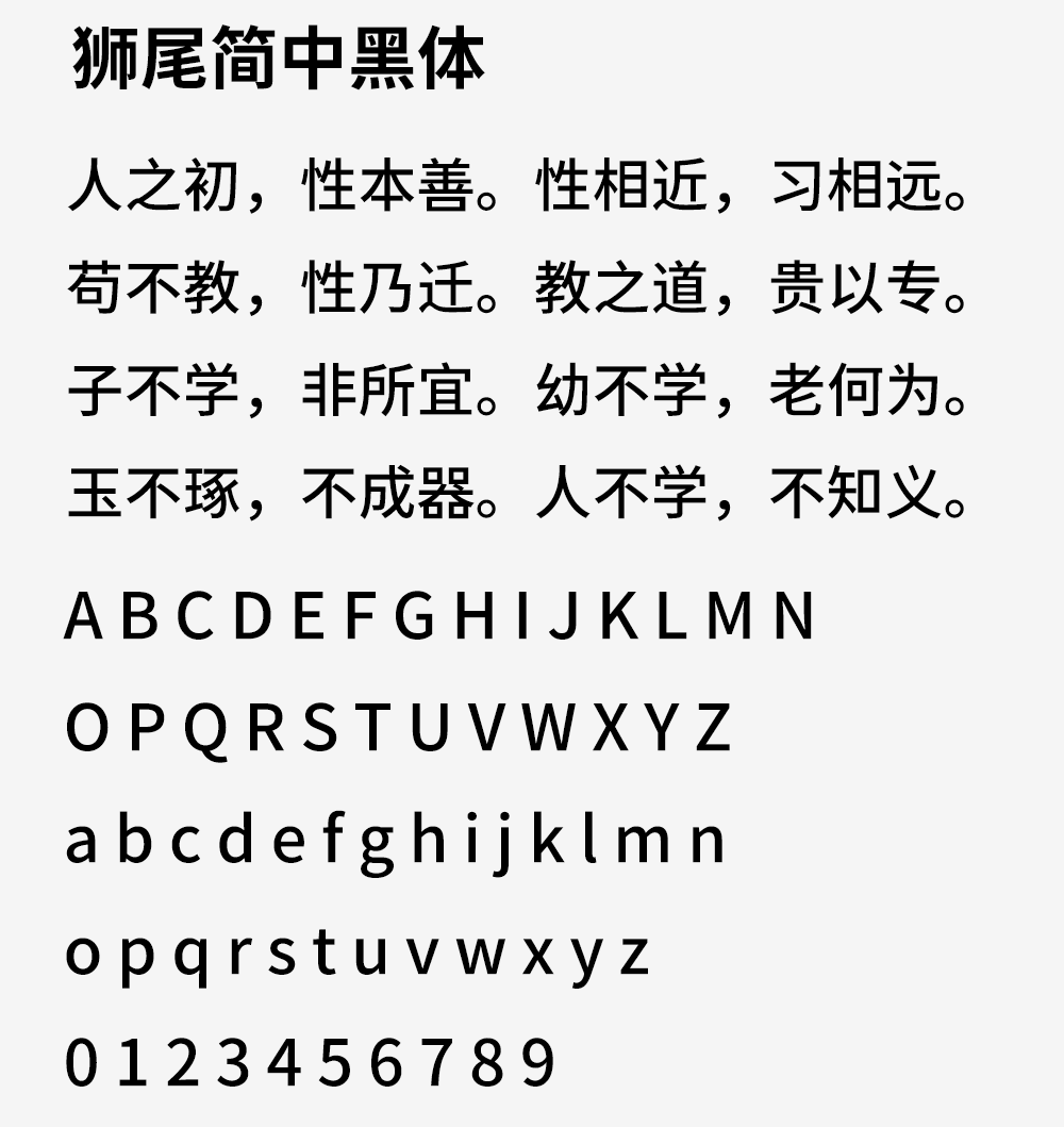 狮尾简中黑体基于思源黑体的繁转简字型(繁转简的意思就是输入繁体字时,会自动显示成简体字),狮尾简中黑体的特色是「繁体字转成简体字的字型档」,由于是转成简体,所以能处理「一简对多繁」。狮尾简中黑体设计上针对笔画粗细有7种字重,所以不论大标、小标、简单的段落排版都能清晰辨识。可以免费商用,欢迎大家自由应用、自由优化、自由改作!