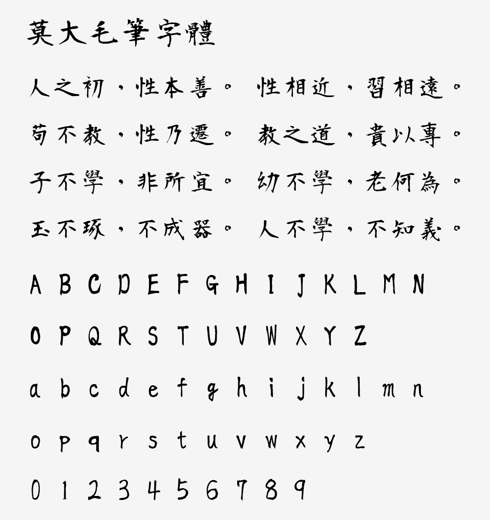 莫大毛笔字体是基于衡山毛笔字体的开放原始码中文字型。衡山毛笔字体是来自于日本书法家青柳衡山,修改前文字+符号数约:13,000字,修改后文字+符号数:24,896字,增加11,281字符。可以免费商用,欢迎大家自由应用、自由优化、自由改作!