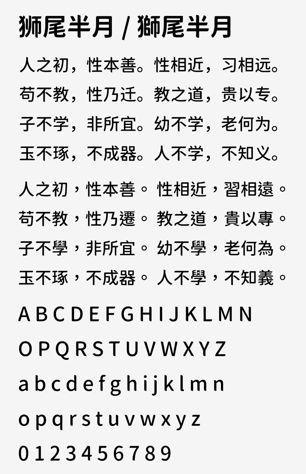 狮尾半月字体基于思源黑体的拔脚和加半圆改造,不圆也不方的字体,特色之一是「十」长的像忍者的手里剑。和思源黑体一样,有7种字重,支持简体中文、繁体中文、韩文与日文。