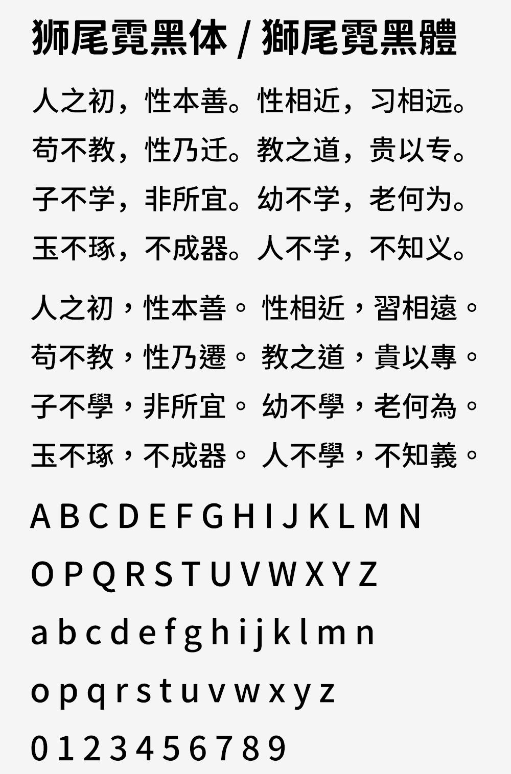 狮尾霓黑体基于思源黑体的上半边变圆和拔脚改造,更加简明现代化的字体。狮尾霓黑体的特色是上半边圆体+下半边黑体,一个综合的字体,「口」字的上沿有一点点像彩虹形状。和思源黑体一样,有7种字重,支持简体中文、繁体中文、韩文与日文,可以免费商用,欢迎大家自由应用、自由优化、自由改作!