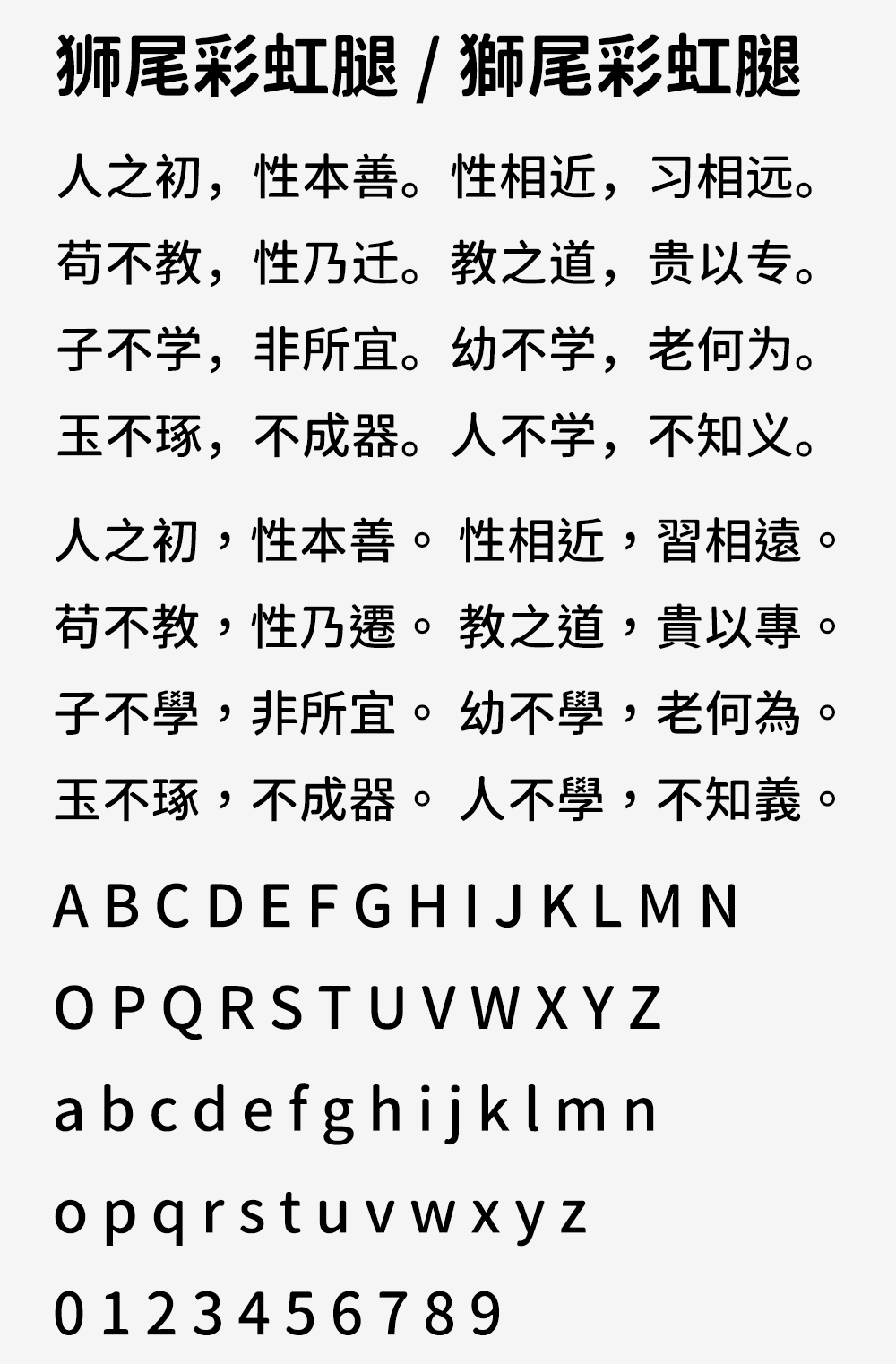 狮尾彩虹腿基于思源黑体的上半边变圆改造,更加简明现代化的字体。狮尾彩虹腿的特色是上半边圆体+下半边黑体,一个综合的字体,「口」字的上沿有一点点像彩虹形状。和思源黑体一样,有7种字重,支持简体中文、繁体中文、韩文与日文,可以免费商用,欢迎大家自由应用、自由优化、自由改作!