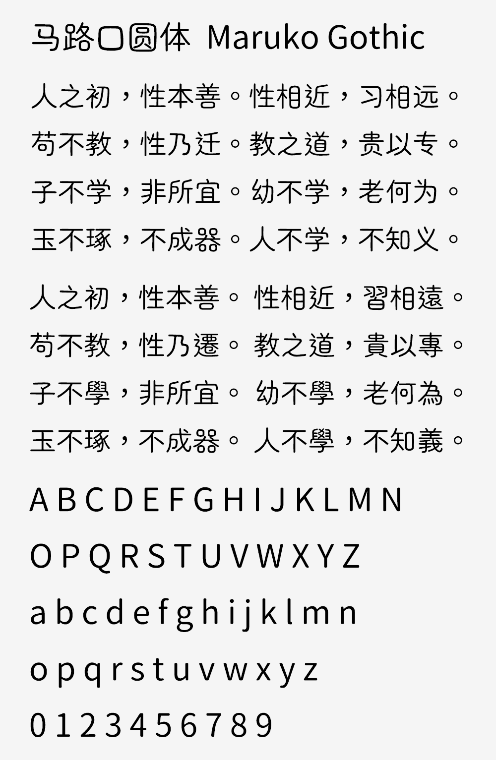 马路口圆体(Maruko Gothic)是Zen圆体 ZenMaruGothic字体的补字计划。与原作者的主要差异是调整部件写法、新增中文字、增加一些符号。可以免费商用,欢迎大家自由应用、自由优化、自由改作!