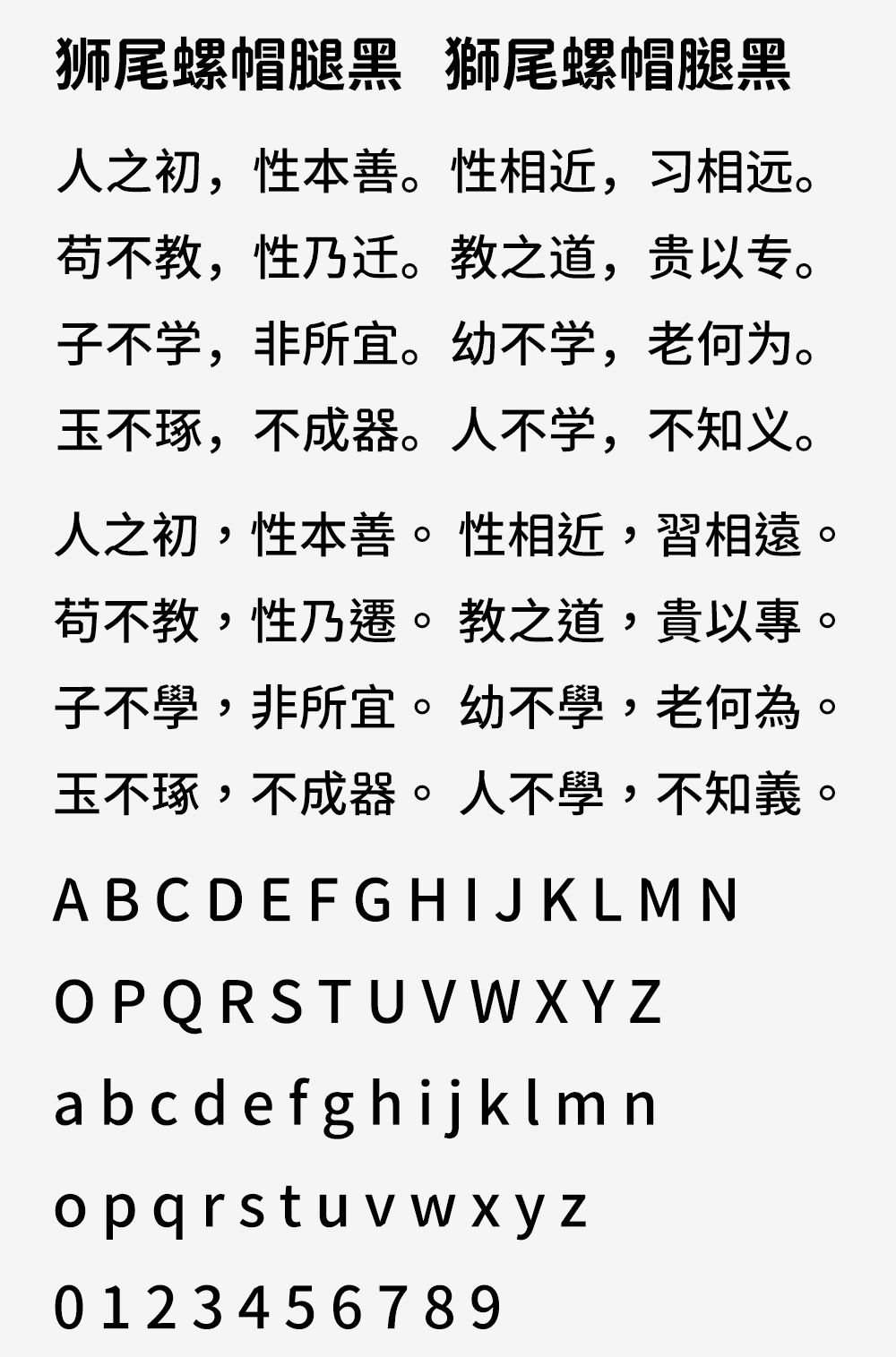 狮尾螺帽腿黑基于思源黑体增加斜角改造,更加简明现代化的字体。狮尾螺帽黑体的特色是「口」字的转角处增加一个斜角,外形有点像螺帽。和思源黑体一样,有7种字重,支持简体中文、繁体中文、韩文与日文,可以免费商用,欢迎大家自由应用、自由优化、自由改作!