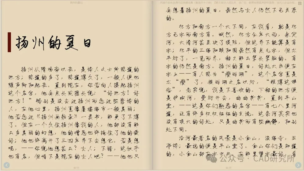 写字其实有些枯燥,所以在创作初期,我并不是按照字典从头到尾开始写,而是挑选一些我喜欢的文章来进行书写,顺便测试排版效果。其中,有一篇恰好是朱自清的《荷塘月色》。开篇的第一句话:“这几天心里颇不宁静”,深深触动了我。作为一个设计师,反复修改作品确实让人心情不宁静。读到朱自清悄悄披上大衫走出门外的情景时,我想,1927年的朱自清或许也是个白天上班后感到疲惫,晚上外出散心的人吧。与文中那种既有淡淡的喜悦,又有淡淡的哀愁的复杂情感,我不禁感同身受。作为同为父亲的人,我倍感共鸣。