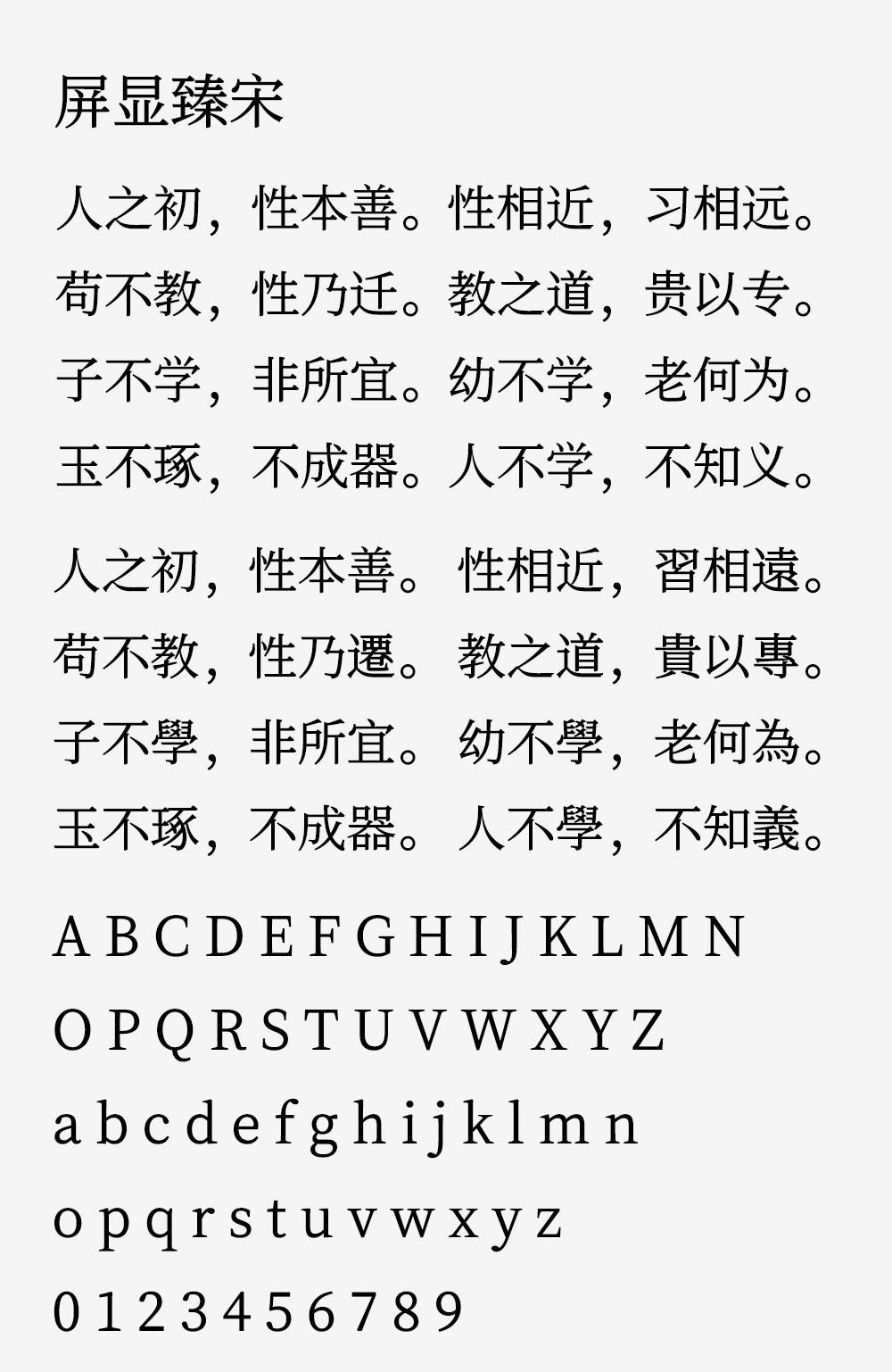 屏显臻宋(早期名字叫思源屏显臻宋)是基于思源宋体的屏幕显示优化字体,由CPC中文印刷社区用户chncwk制作,可以用于手机替换字体,比较复古清爽。