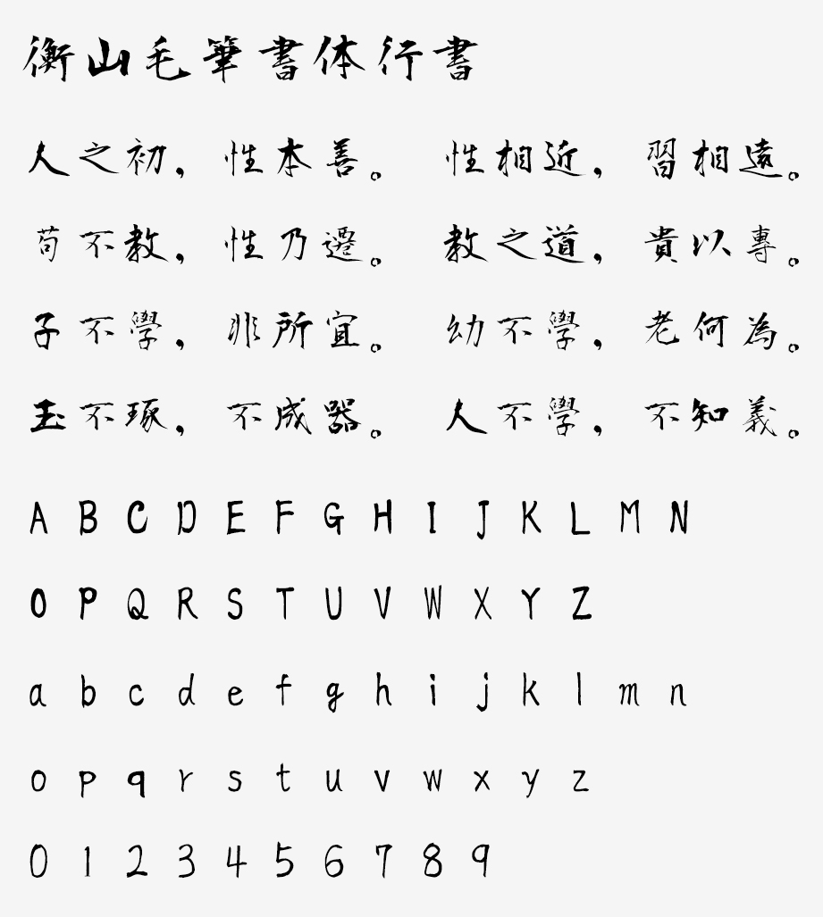 衡山毛笔字体行书(衡山毛筆フォント行書)是日本书法家青柳衡山先生书写创作的行书字体,收录了JIS非汉字、JIS第一水平汉字、JIS第二水平汉字,可以免费商用,没有限制,徽标等也可以自由使用,没有任何保证,请自行承担使用风险,在杂志、书籍上使用也是自由的。