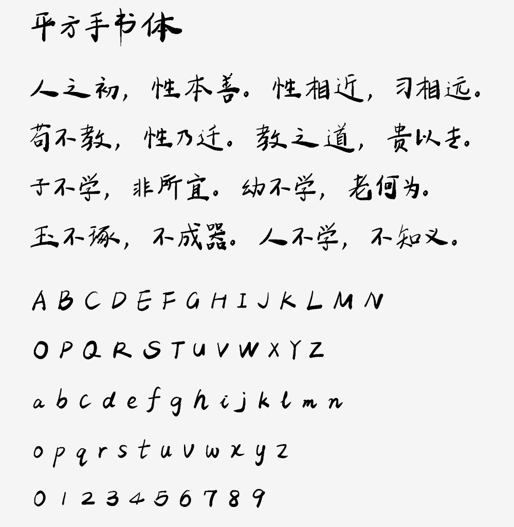 平方手书体是一款艺术手写体字体,其笔画粗细适中,书写自然流畅,呈现出优雅的视觉美感,适用于艺术创作、平面广告设计、书法临摹练习等设计需求。