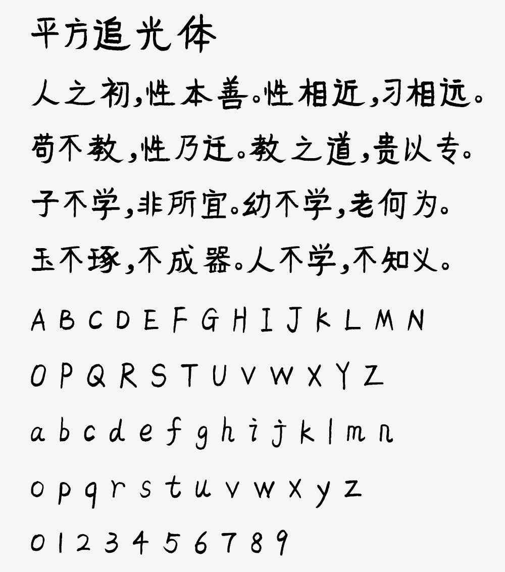平方追光体是一款具有手写艺术风格的创意字体,其线条粗细变化自然,竖钩笔画融入圆弧设计元素,整体呈现灵动活泼的视觉效果,适用于各类设计需求。