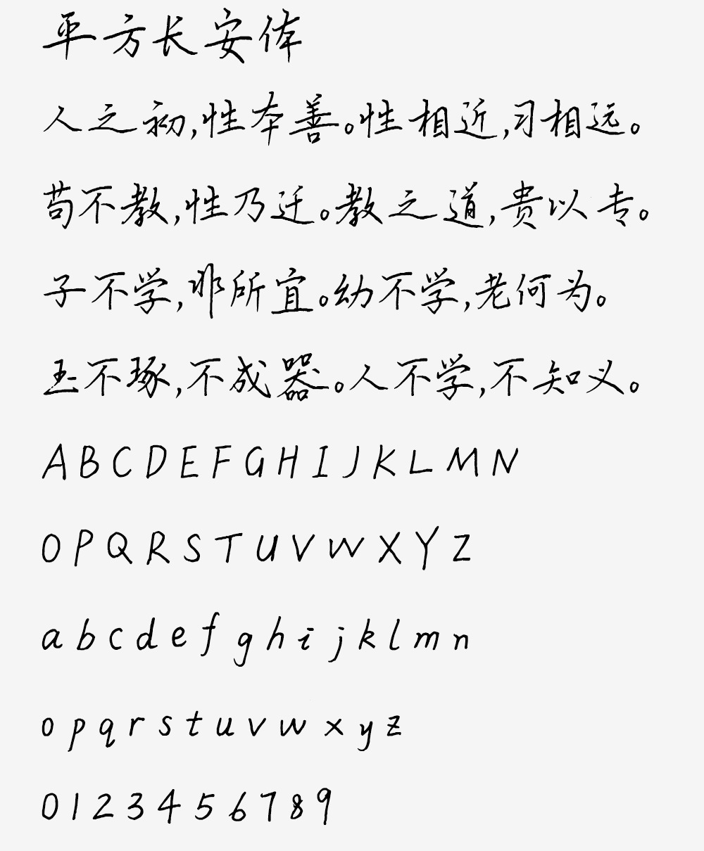 平方长安体是一款兼具艺术性与实用性的硬笔手写字体,其设计特点鲜明,笔画纤细而不失力度,收放自如,中宫结构紧凑,连笔处婉转流畅。这款字体完美融合了书法韵味与现代设计需求,适用于广告创意、名片制作、产品包装及印刷设计等领域。