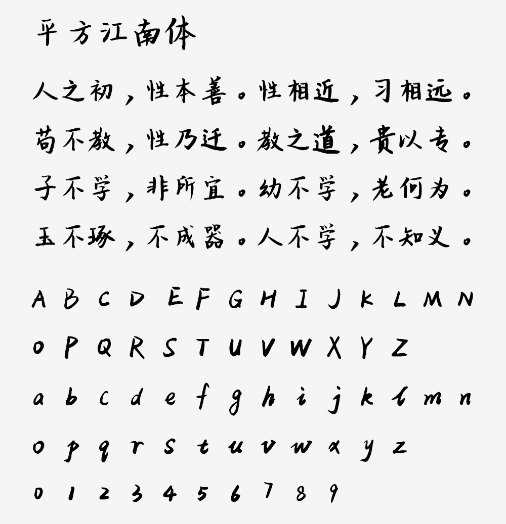 平方江南体是一款创意手写字体,笔画粗细匀称得当,字形结构工整大方,出色的视觉表现力,适用于艺术创作、平面广告以及书法临摹范本等多种设计场景