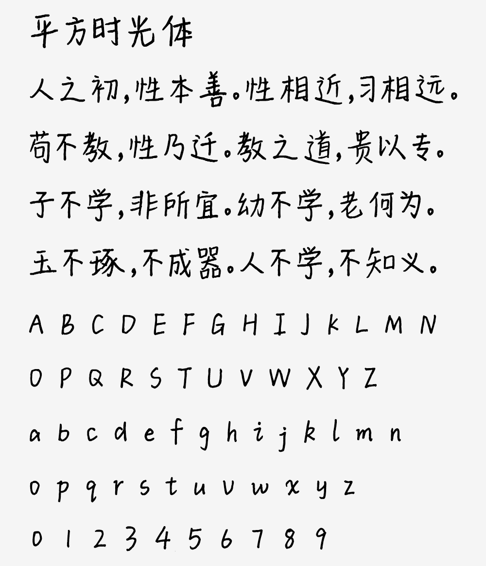 平方时光体是一款充满文艺气息的手写风格字体,其笔触流畅自然,线条细腻均匀,字形端庄秀丽,适合用于日记、信件、手账及海报等各类文艺设计场景。