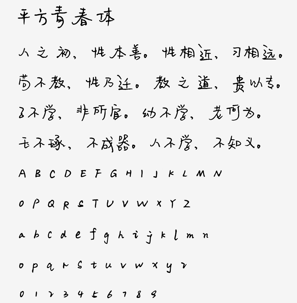 平方青春体是一款充满文艺气息的手写字体,线条流畅均匀,笔画末端微微上扬,字形修长挺拔,清新脱俗,散发着优雅的气质,适合用于各类文艺范场景。