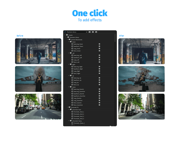 预设说明:超过800种专业效果。 包含Premiere Pro的800种效果和素材,可为您节省大量时间,并在几分钟之内帮助您专业地编辑视频。相机运动,色度效果,色彩效果,失真,漏光,屏幕跳动,速度跳动,过渡,色彩校正,屏幕效果。每个类别都包含不同类型的效果,并创建独特的时尚外观。一键套用预设。