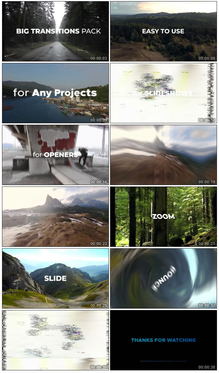 预设说明:Premiere模板-100种拉伸缩放旋转干扰抖动平移无缝视频转场预设 Transitions Pack+使用教程